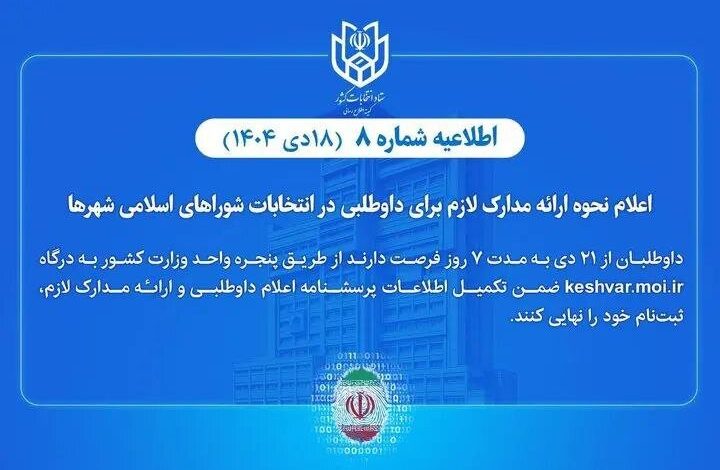 به آگاهی عموم ملت شریف ایران اسلامی میرساند، پیرو اطلاعیه شماره ۷، ثبتنام از داوطلبان عضویت در شوراهای اسلامی شهرها از ساعت ۸ یکشنبه ۱۴۰۴/۱۰/۲۱ آغاز و تا شنبه ۱۴۰۴/۱۰/۲۷ جمعاً به مدت ۷ روز به ادامه خواهد یافت.