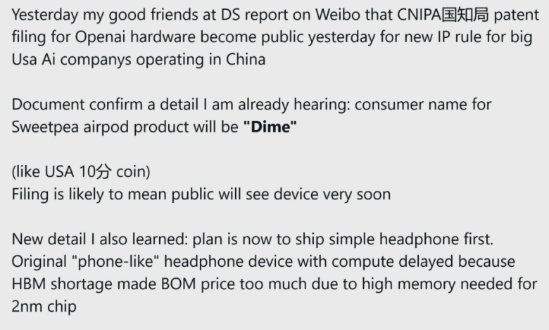 اسکرین‌شات از یک پست در شبکه اجتماعی Weibo درباره شایعات سخت‌افزار جدید OpenAI با نام احتمالی Dime.